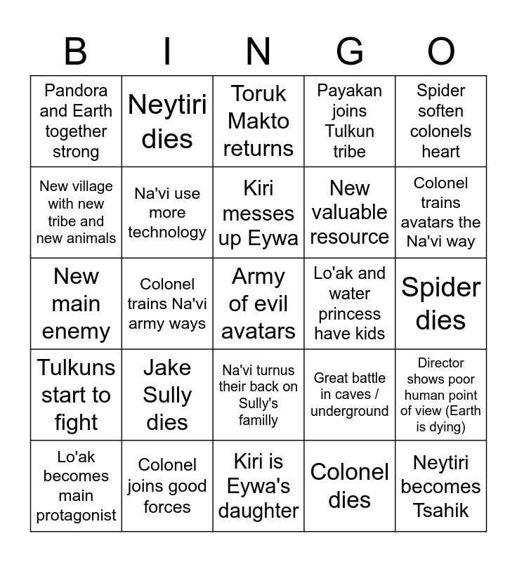 This bingo card has a free space and 24 words: Jake Sully dies, Colonel joins good forces, Kiri messes up Eywa, Lo'ak becomes main protagonist, Spider soften colonels heart, Pandora and Earth together strong, New village with new tribe and new animals, Neytiri dies, Lo'ak and water princess have kids, Na'vi turnus their back on Sully's familly, New valuable resource, New main enemy, Great battle in caves / underground, Director shows poor human point of view (Earth is dying), Na'vi use more technology, Colonel dies, Spider dies, Toruk Makto returns, Colonel trains avatars the Na'vi way, Colonel trains Na'vi army ways, Neytiri becomes Tsahik, Tulkuns start to fight, Payakan joins Tulkun tribe and Kiri is Eywa's daughter.