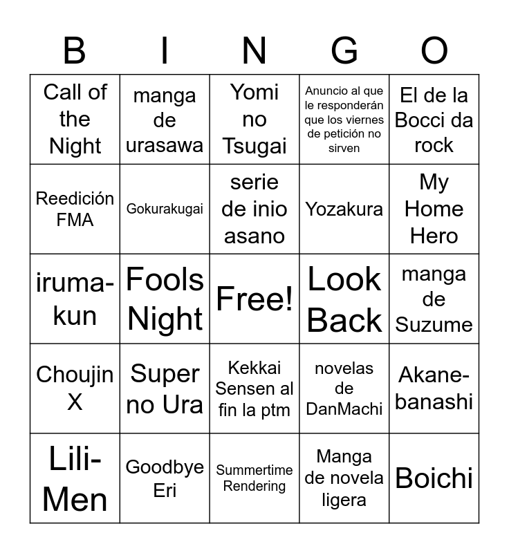 This bingo card has a free space and 24 words: Super no Ura, Goodbye Eri, serie de inio asano, Lili-Men, El de la Bocci da rock, Call of the Night, Reedición FMA, manga de urasawa, Look Back, Kekkai Sensen al fin la ptm, Yozakura, iruma-kun, novelas de DanMachi, Akane-banashi, Gokurakugai, Manga de novela ligera, manga de Suzume, Yomi no Tsugai, My Home Hero, Fools Night, Boichi, Choujin X, Anuncio al que le responderán que los viernes de petición no sirven and Summertime Rendering.