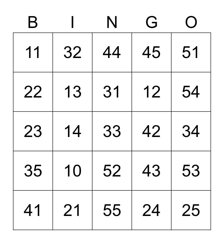 This bingo card has a free space and 24 words: 10, 21, 31, 41, 51, 11, 22, 32, 42, 52, 12, 23, 43, 53, 13, 24, 34, 44, 54, 14, 25, 35, 45 and 55.