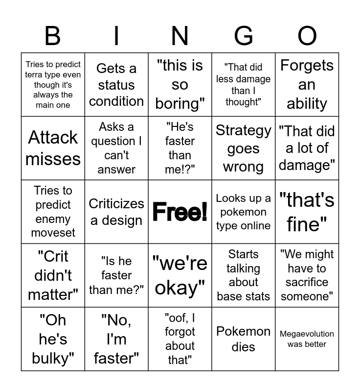 This bingo card has a free space and 24 words: "Is he faster than me?", "No, I'm faster", "He's faster than me!?", "Oh he's bulky", Forgets an ability, Tries to predict terra type even though it's always the main one, Attack misses, Gets a status condition, Looks up a pokemon type online, "we're okay", Strategy goes wrong, Tries to predict enemy moveset, Starts talking about base stats, "We might have to sacrifice someone", Asks a question I can't answer, Pokemon dies, "that's fine", "this is so boring", "That did a lot of damage", Criticizes a design, Megaevolution was better, "Crit didn't matter", "That did less damage than I thought" and "oof, I forgot about that".