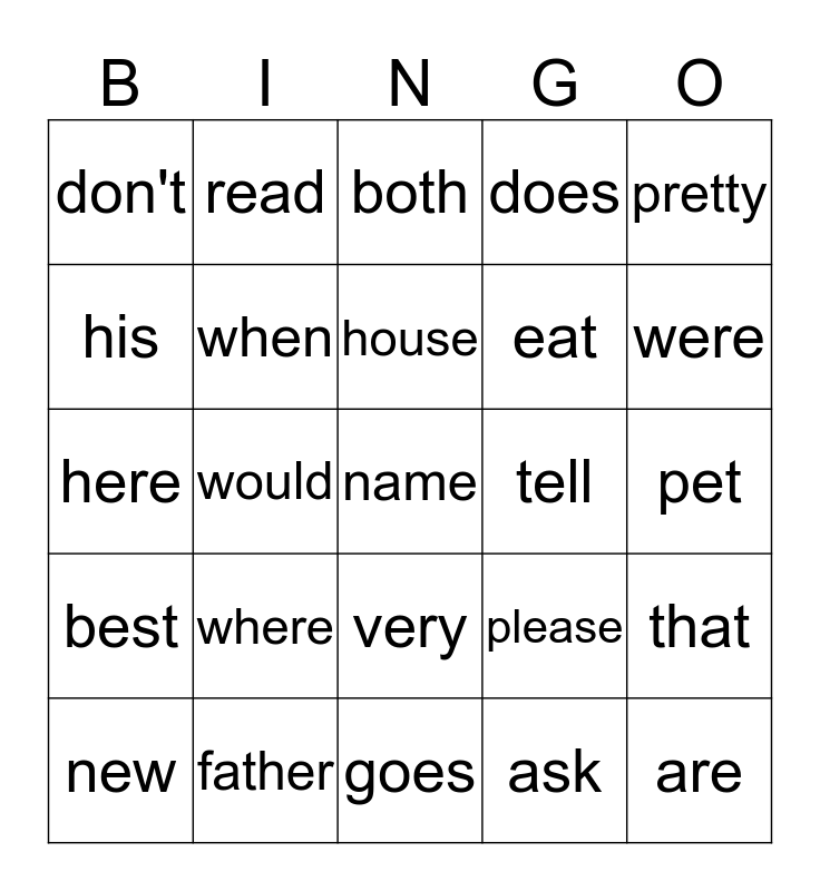 This bingo card has a free space and 24 words: where, father, house, new, pretty, don't, his, read, tell, very, eat, here, please, that, when, ask, pet, both, were, would, are, best, does and goes.
