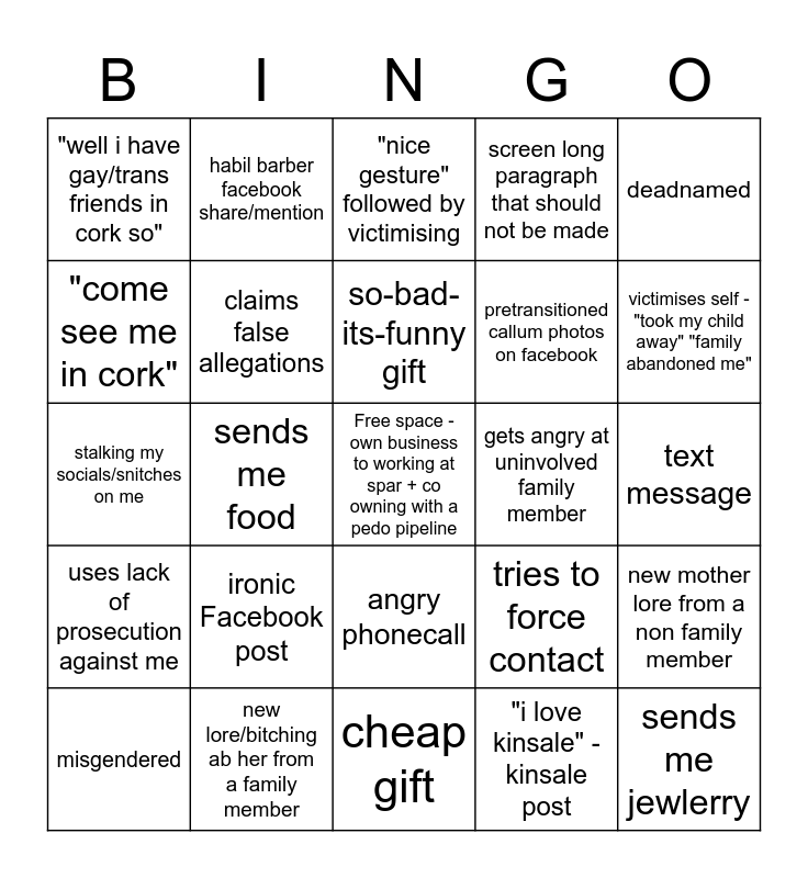 This bingo card has a free space and 25 words: ironic Facebook post, cheap gift, so-bad-its-funny gift, misgendered, deadnamed, "well i have gay/trans friends in cork so", "come see me in cork", habil barber facebook share/mention, gets angry at uninvolved family member, angry phonecall, pretransitioned callum photos on facebook, stalking my socials/snitches on me, tries to force contact, new mother lore from a non family member, claims false allegations, *the* confirmation photo, text message, "nice gesture" followed by victimising, victimises self - "took my child away" "family abandoned me", sends me food, sends me jewlerry, new lore/bitching ab her from a family member, uses lack of prosecution against me, screen long paragraph that should not be made and "i love kinsale" -kinsale post.