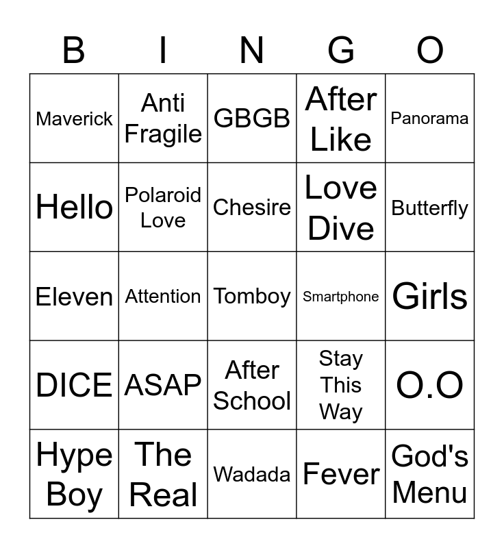 This bingo card has 25 words: ASAP, Wadada, Chesire, Hype Boy, Panorama, Maverick, Hello, Anti Fragile, Smartphone, After School, Love Dive, Eleven, Stay This Way, O.O, Polaroid Love, God's Menu, Girls, GBGB, Butterfly, Attention, Tomboy, The Real, DICE, After Like and Fever.