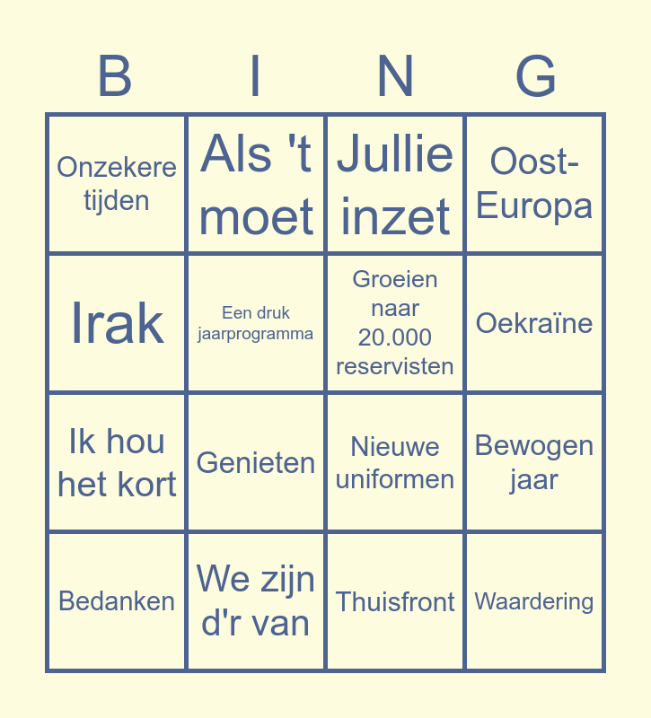 This bingo card has 25 words: Bart's verjaardag, BB TIN, Oekraïne, Limburg, Irak, Onzekere tijden, Een druk jaarprogramma, Als 't moet, We zijn d'r van, 80% aanwezigheid, Ik hou het kort, Nieuwe uniformen, VOSS, Nieuwe collega's, Groeien naar 20.000 reservisten, Vrijwillig maar niet vrijblijvend, Thuisfront, Jullie inzet, Genieten, Bewogen jaar, Bedanken, Betrokkenheid, Waardering, Oost-Europa and Rusland.