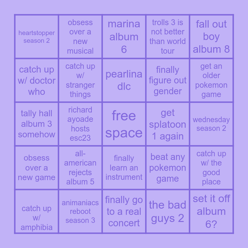 This bingo card has a free space and 24 words: all-american rejects album 5, animaniacs reboot season 3, pearlina dlc, catch up w/ amphibia, fall out boy album 8, heartstopper season 2, catch up w/ doctor who, obsess over a new musical, get splatoon 1 again, finally learn an instrument, finally figure out gender, tally hall album 3 somehow, beat any pokemon game, catch up w/ the good place, catch up w/ stranger things, the bad guys 2, wednesday season 2, marina album 6, get an older pokemon game, richard ayoade hosts esc23, set it off album 6?, obsess over a new game, trolls 3 is not better than world tour and finally go to a real concert.
