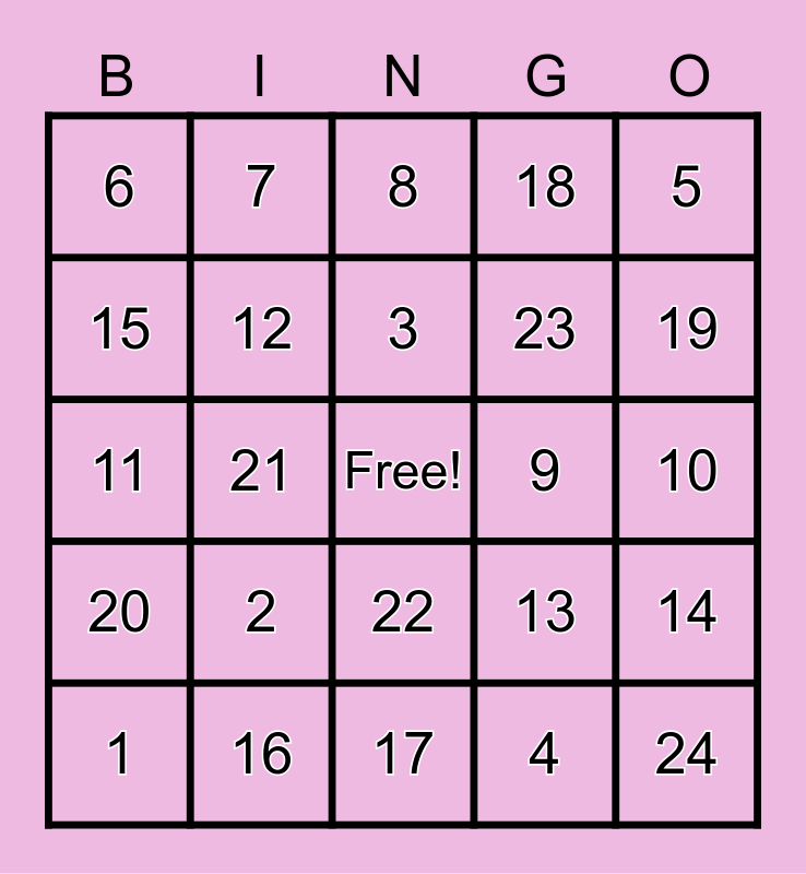 This bingo card has a free space and 24 words: 1, 2, 3, 4, 5, 6, 7, 8, 9, 10, 11, 12, 13, 14, 15, 16, 17, 18, 19, 20, 21, 22, 23 and 24.