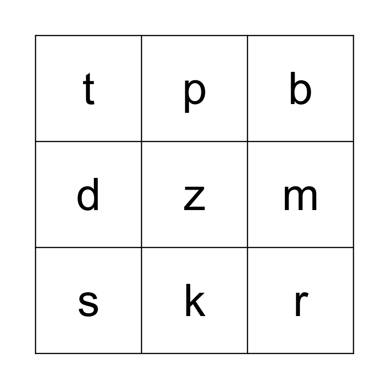 This bingo card has 9 words: s, b, p, d, t, m, z, r and k.