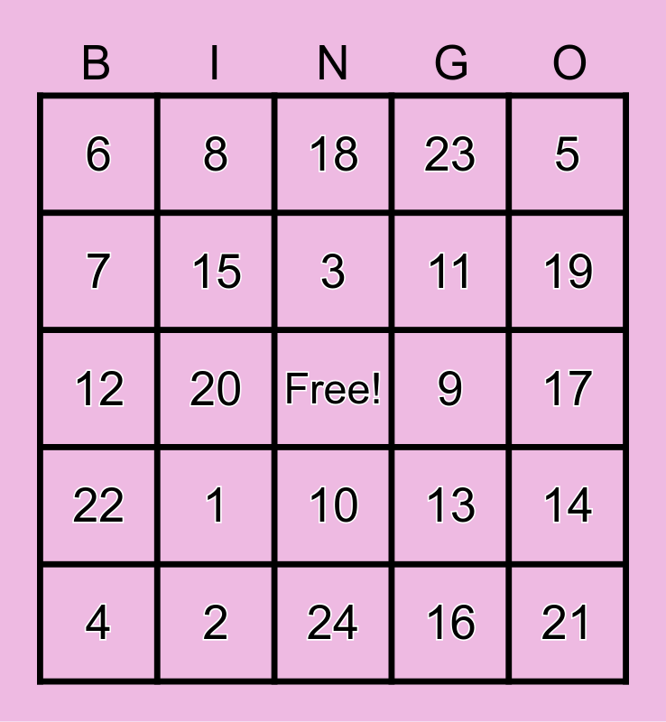 This bingo card has a free space and 24 words: 1, 2, 3, 4, 5, 6, 7, 8, 9, 10, 11, 12, 13, 14, 15, 16, 17, 18, 19, 20, 21, 22, 23 and 24.