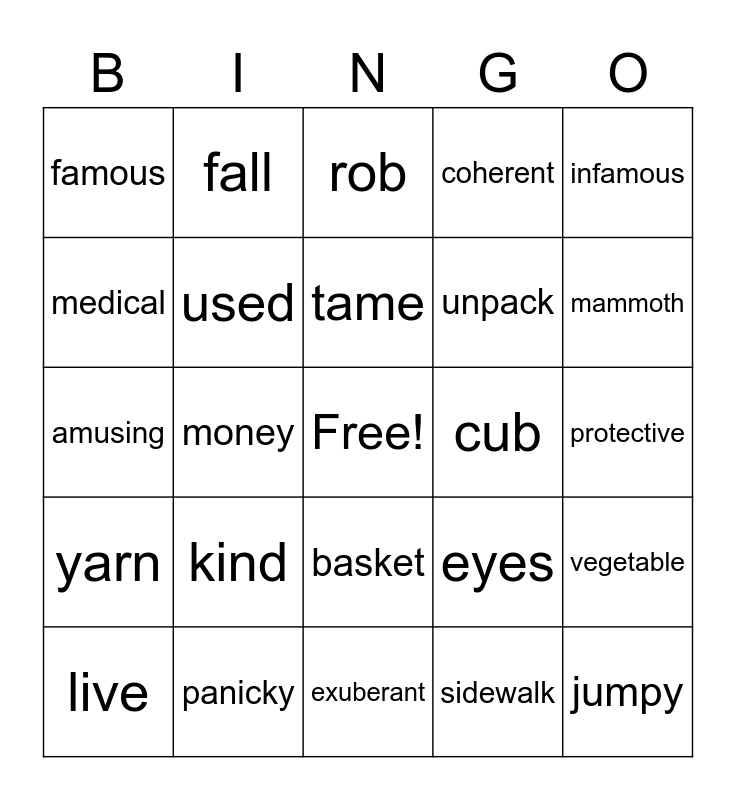 This bingo card has a free space and 75 words: witty, sail, rob, volleyball, trousers, shelf, attempt, inconclusive, fuzzy, wrathful, upbeat, plucky, tame, medical, abortive, money, sprout, jumpy, annoyed, infamous, destruction, amusing, used, fall, coherent, zip, ruin, savory, woebegone, calm, unit, simple, zippy, eyes, mammoth, unpack, tiny, time, protective, sidewalk, face, shaky, mask, interrupt, rude, jellyfish, live, famous, beds, tongue, suspend, basket, pie, instrument, irritating, crawl, impolite, trees, mass, little, kind, toes, cluttered, leather, harass, cub, well-to-do, realize, amount, vegetable, yarn, panicky, heavy, exuberant and fixed.