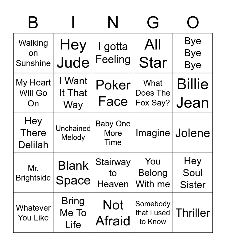 This bingo card has 60 words: Wake me up when September Ends, Bring Me To Life, A Thousand Miles, Mr. Brightside, Somebody that I used to Know, Piano Man, I Want It That Way, Livin’ On A Prayer, What Does The Fox Say?, Gangnam Style, All Star, Never Gonna Give You Up, My Heart Will Go On, Don’t Stop Believing, Eye of the Tiger, Walking on Sunshine, Baby One More Time, Bye Bye Bye, Hey Ya, Poker Face, Imagine, I gotta Feeling, Whatever You Like, Hey Soul Sister, Ice Ice Baby, Total Eclipse of the Heart, Single Ladies, Baby, Billie Jean, Call Me Maybe, Ring of Fire, What Makes You Beautiful, Dynamite, A Thousand Years, Hey Jude, I Want To Hold Your Hand, Hound Dog, Unchained Melody, Jailhouse Rock, Hey There Delilah, What a Wonderful World, Blank Space, Jolene, Wrecking Ball, You Belong With me, Cool For The Summer, Party in the USA, Welcome To My Life, The Sound of Silence, Stairway to Heaven, Not Afraid, Roar, Payphone, See You Again, Hello, Thrift Shop, Bohemian Rhaspody, Where is the Love, Thriller and I Will Always Love You.