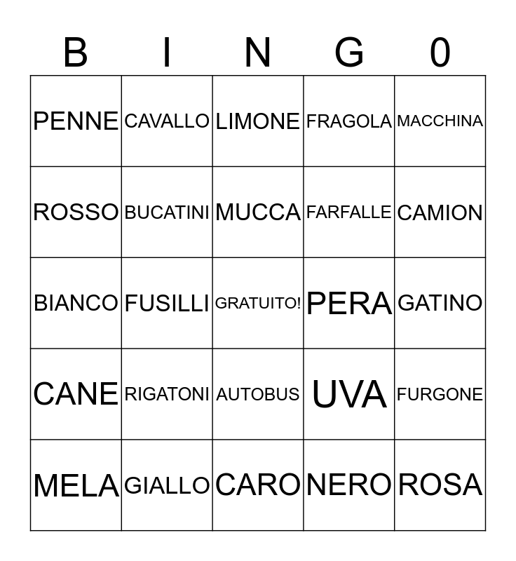This bingo card has a free space and 24 words: RIGATONI, GIALLO, MUCCA, MELA, MACCHINA, PENNE, ROSSO, CAVALLO, PERA, AUTOBUS, FARFALLE, BIANCO, UVA, FURGONE, BUCATINI, NERO, GATINO, LIMONE, CAMION, FUSILLI, ROSA, CANE, FRAGOLA and CARO.
