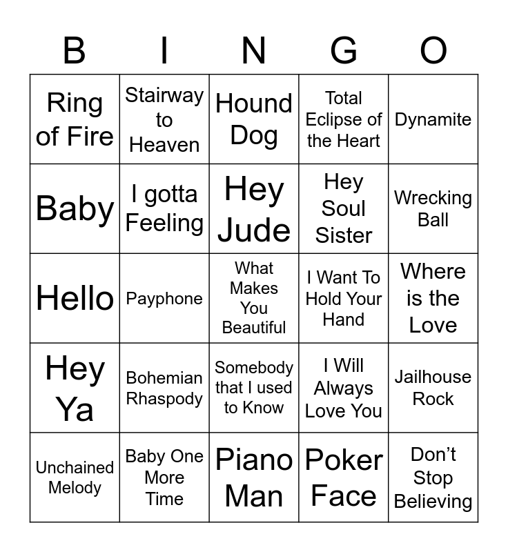 This bingo card has 60 words: Walking on Sunshine, Baby One More Time, Bye Bye Bye, Hey Ya, Poker Face, Imagine, I gotta Feeling, Whatever You Like, Hey Soul Sister, Ice Ice Baby, Total Eclipse of the Heart, Single Ladies, Baby, Billie Jean, Call Me Maybe, Ring of Fire, What Makes You Beautiful, Dynamite, A Thousand Years, Hey Jude, I Want To Hold Your Hand, Hound Dog, Unchained Melody, Jailhouse Rock, Hey There Delilah, What a Wonderful World, Blank Space, Jolene, Wrecking Ball, You Belong With me, Cool For The Summer, Party in the USA, Welcome To My Life, The Sound of Silence, Stairway to Heaven, Not Afraid, Roar, Payphone, See You Again, Hello, Thrift Shop, Bohemian Rhaspody, Where is the Love, Thriller, I Will Always Love You, Wake me up when September Ends, Bring Me To Life, A Thousand Miles, Mr. Brightside, Somebody that I used to Know, Piano Man, I Want It That Way, Livin’ On A Prayer, What Does The Fox Say?, Gangnam Style, All Star, Never Gonna Give You Up, My Heart Will Go On, Don’t Stop Believing and Eye of the Tiger.