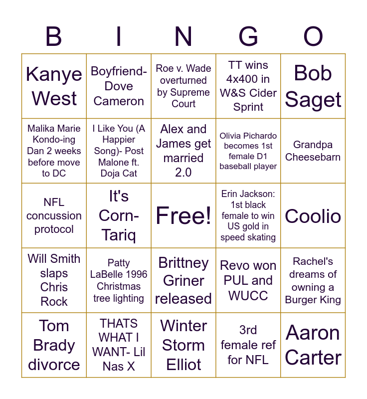 This bingo card has a free space and 59 words: Kim C starting Queen City Gambit, THATS WHAT I WANT- Lil Nas X, Sam becomes a cat mom, Chloe Kim wins back to back halfpipe golds, Rachel's dreams of owning a Burger King, DeShaun Watson Browns deal, I Like You (A Happier Song)- Post Malone ft. Doja Cat, WUCC 2.0, Erin Jackson: 1st black female to win US gold in speed skating, Robbie Coltrane, Malika Marie Kondo-ing Dan 2 weeks before move to DC, Cuff It- Beyonce, Olivia Pichardo becomes 1st female D1 baseball player, Straight Mary, Olivia Wilde served divorce papers on stage, Boyfriend- Dove Cameron, Alex and James get married 2.0, TT wins 4x400 in W&S Cider Sprint, Kirstie Alley, NFL concussion protocol, It's Corn- Tariq, Roe v. Wade overturned by Supreme Court, Sureshot beats Y'all at Regionals, Coolio, Trump investigation, Bam Bam- Camila Cabello, Ed Sheeran, Brittney Griner released, Serena Williams retires, Bob Saget, Kim K rips Marilyn Monroe dress, Bad Habit- Steve Lacy, Taylor Swift breaks Ticketmaster, Katie Ledecky smashes 1500m record by 10s, Leslie Jordan, Kanye West, First Class- Jack Harlow, Ukraine invaded by Russia, Revo won PUL and WUCC, Stephen 'tWitch' Boss, Will Smith slaps Chris Rock, Unholy- Sam Smith, Winter Storm Elliot, 3rd female ref for NFL, Meat Loaf, Johnny Depp/Amber Heard trial, Anti-Hero- Taylor Swift, Bengals make Super Bowl, USWNT agreement for equal pay, Grandpa Cheesebarn, Tom Brady divorce, As It Was- Harry Styles, Highest average gas prices, 50th anniversary of Title IX, Aaron Carter, Ned Fulmer cheating on Ariel, Patty LaBelle 1996 Christmas tree lighting, Hurricane Ian, Women refs at men's world cup and Queen Elizabeth.