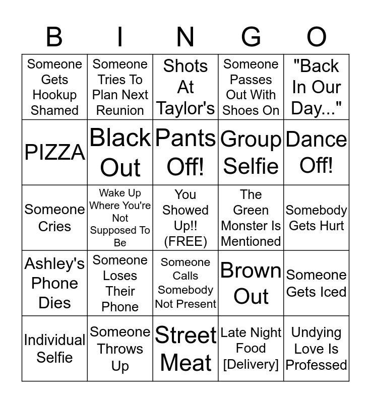 This bingo card has a free space and 24 words: Someone Loses Their Phone, Someone Throws Up, Pants Off!, Individual Selfie, "Back In Our Day...", Someone Gets Hookup Shamed, PIZZA, Someone Tries To Plan Next Reunion, The Green Monster Is Mentioned, Someone Calls Somebody Not Present, Group Selfie, Someone Cries, Brown Out, Someone Gets Iced, Black Out, Late Night Food [Delivery], Somebody Gets Hurt, Shots At Taylor's, Dance Off!, Wake Up Where You're Not Supposed To Be, Undying Love Is Professed, Ashley's Phone Dies, Someone Passes Out With Shoes On and Street Meat.