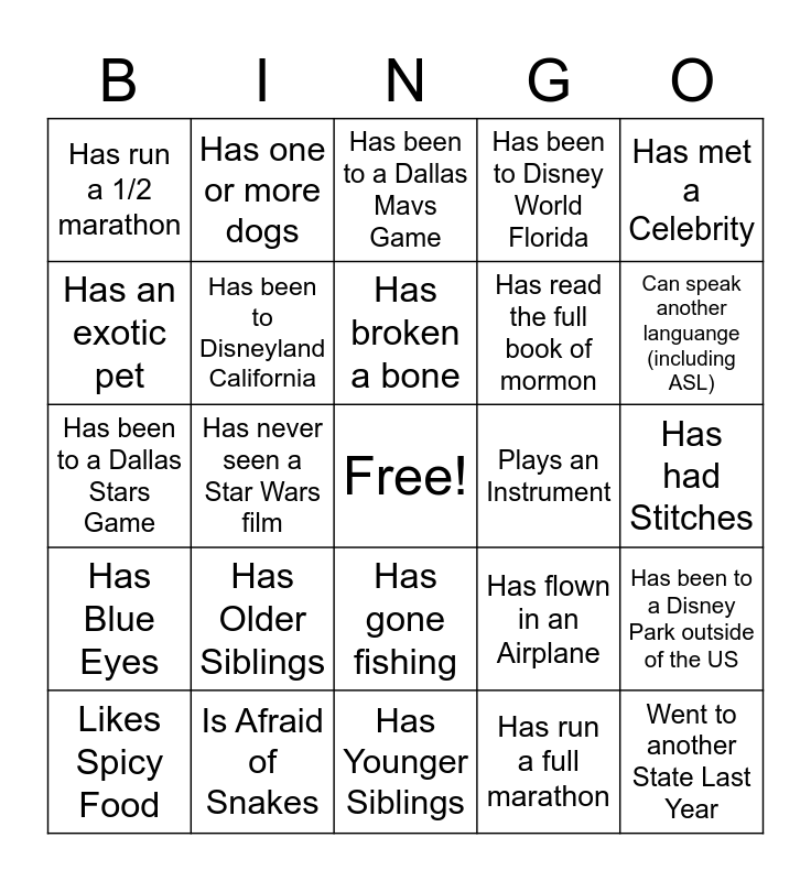 This bingo card has a free space and 47 words: Went to a Family Reunion Last Year, Went to another State Last Year, Has Visited Another Country, Has Younger Siblings, Has Older Siblings, Has an Older Sibling Serve (or currently serving) a Mission, Has one or more dogs, Has one or more cats, Has an exotic pet, Has been on a cruise, Has been to Disneyland California, Has been to Disney World Florida, Has been to a Disney Park outside of the US, Has flown in an Airplane, Has take a road trip last year, Was born in a different state, Has broken a bone, Plays an Instrument, Plays a sport, Has met a Celebrity, Has never seen a Star Wars film, Has run a full marathon, Has run a 1/2 marathon, Has read the full book of mormon, Is Left-Handed, Can speak another languange (including ASL), Likes Spicy Food, Has shot a gun, Has gone fishing, Has Blue Eyes, Has Brown Eyes, Has Blonde Hair, Has Black Hair, Has Brown Hair, Is Afraid of Spiders, Is Afraid of Snakes, Has had Stitches, Has been Snorkling, Has riden a horse, Wears glasses or contacts, Has caught a fish, Has been to a Dallas Mavs Game, Has been to a Dallas Stars Game, Has swam in the ocean, Has been snow skiing, Has a gym membership and Has been to Utah.