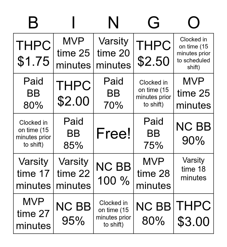 This bingo card has a free space and 24 words: MVP time 27 minutes, Varsity time 22 minutes, Paid BB 70%, NC BB 80%, Clocked in on time (15 minutes prior to scheduled shift), THPC $1.75, MVP time 25 minutes, Varsity time 20 minutes, Paid BB 75%, NC BB 90%, Clocked in on time (15 minutes prior to shift), THPC $2.00, MVP time 28 minutes, Varsity time 18 minutes, Paid BB 80%, NC BB 95%, Clocked in on time (15 minutes prior to shift), THPC $2.50, MVP time 25 minutes, Varsity time 17 minutes, Paid BB 85%, NC BB 100 %, Clocked in on time (15 minutes prior to shift) and THPC $3.00.