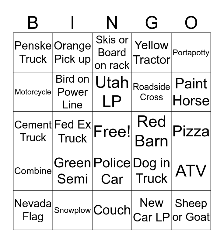 This bingo card has a free space and 24 words: Green Semi, Snowplow, Utah LP, Nevada Flag, Portapotty, Penske Truck, Motorcycle, Orange Pick up, Red Barn, Police Car, Roadside Cross, Cement Truck, Dog in Truck, ATV, Bird on Power Line, New Car LP, Pizza, Skis or Board on rack, Paint Horse, Fed Ex Truck, Sheep or Goat, Combine, Yellow Tractor and Couch.
