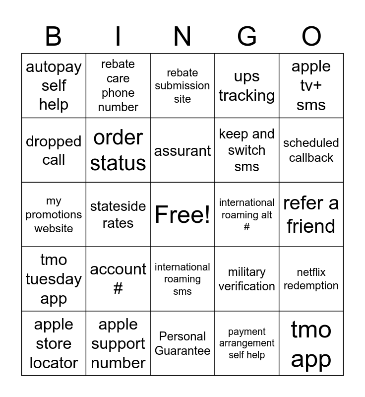 This bingo card has a free space and 24 words: account #, apple support number, assurant, apple store locator, apple tv+ sms, autopay self help, dropped call, rebate care phone number, international roaming alt #, international roaming sms, keep and switch sms, my promotions website, military verification, netflix redemption, order status, payment arrangement self help, refer a friend, rebate submission site, scheduled callback, stateside rates, tmo app, tmo tuesday app, ups tracking and Personal Guarantee.