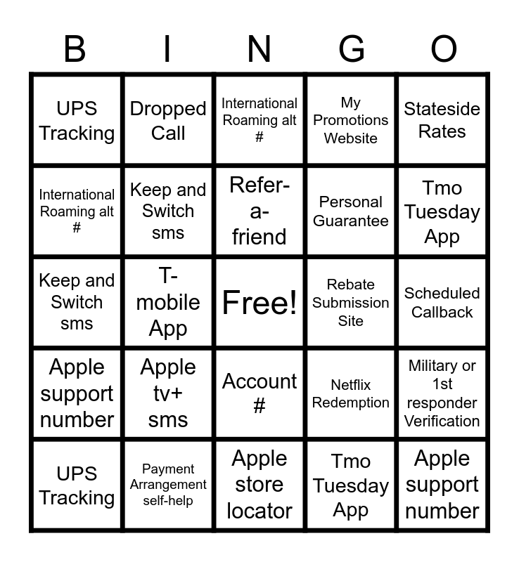 This bingo card has a free space and 48 words: Account #, Apple support number, Assurant, Apple store locator, Apple tv+ sms, Autopay self-help, Dropped Call, Rebate Care PH#, International Roaming alt #, International Roaming SMS, Keep and Switch sms, My Promotions Website, Military or 1st responder Verification, Netflix Redemption, Order Status, Payment Arrangement self-help, Refer-a-friend, Rebate Submission Site, Scheduled Callback, Stateside Rates, T-mobile App, Tmo Tuesday App, UPS Tracking, Personal Guarantee, T-mobile App, Tmo Tuesday App, UPS Tracking, Personal Guarantee, Account #, Apple support number, Assurant, Apple store locator, Apple tv+ sms, Order Status, Payment Arrangement self-help, Refer-a-friend, Rebate Submission Site, Scheduled Callback, Stateside Rates, Autopay self-help, Dropped Call, Rebate Care PH#, International Roaming alt #, International Roaming SMS, Keep and Switch sms, My Promotions Website, Military or 1st responder Verification and Netflix Redemption.