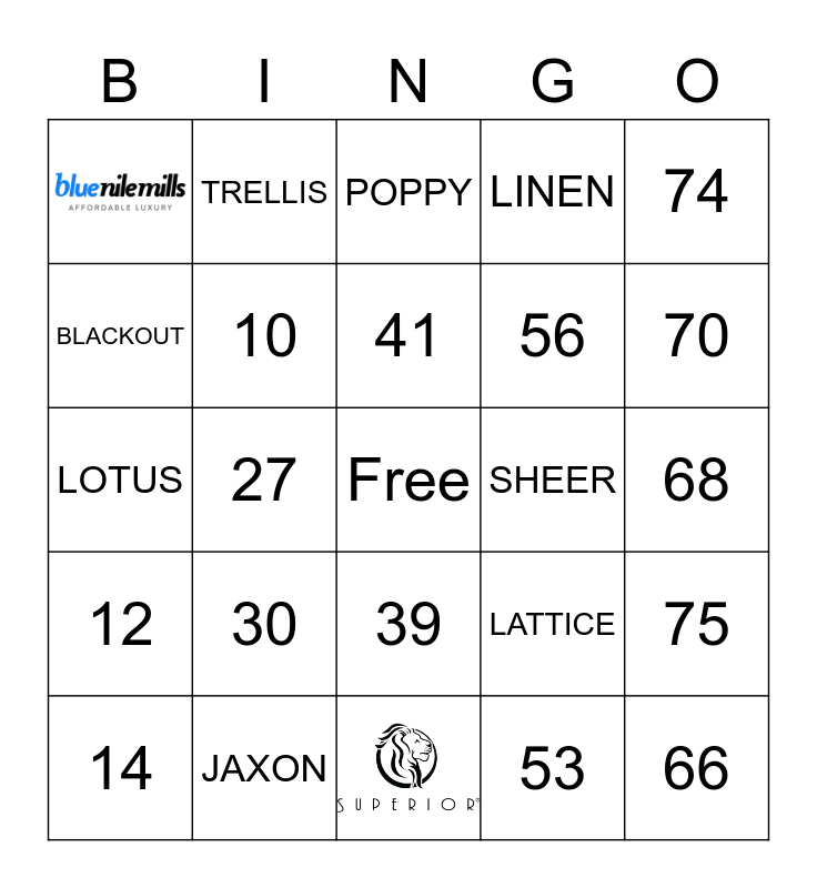 This bingo card has 2 images, a free space and 22 words: 14, 30, 41, 53, 74, TRELLIS, POPPY, SHEER, 68, LOTUS, 10, LATTICE, 75, BLACKOUT, JAXON, LINEN, 70, 12, 27, 39, 56 and 66.