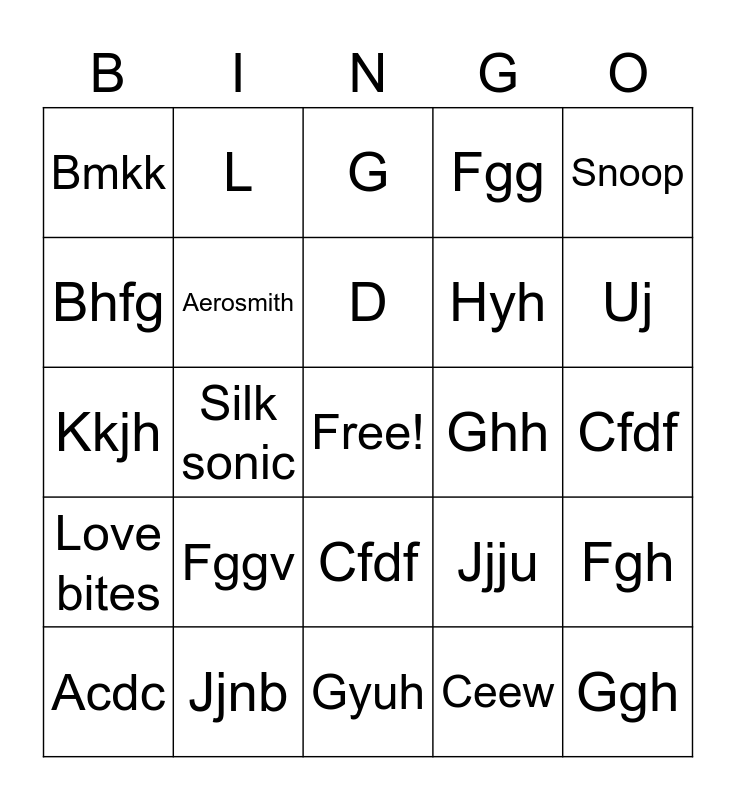 This bingo card has a free space and 33 words: Dreams, All too well, Silk sonic, Out of touch, Love bites, Aerosmith, Snoop, Acdc, L, F, D, G, Y, E, Ghh, Uj, Jjnb, Kkjh, Fggv, Jjju, Cfdf, Jjii, Bmkk, Cfdf, Gyuh, Ggh, Fgg, Hyh, Bhfg, Fgh, Fggg, Ceew and Oooj.