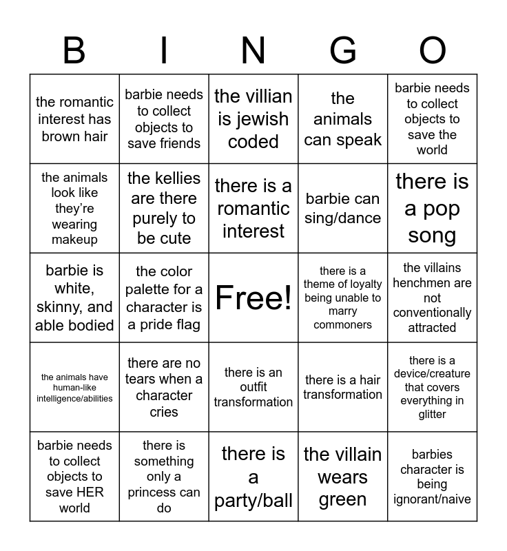 This bingo card has a free space and 33 words: a character is queer coded, barbie’s character is queer coded, the color palette for a character is a pride flag, there is a prophecy, the animals have human-like intelligence/abilities, the kellies are there purely to be cute, barbie needs to collect objects to save the world, barbie needs to collect objects to save HER world, barbie needs to collect objects to save friends, barbie’s counterpart is in blue, there is a romantic interest, the villian is jewish coded, the rival has dark hair, barbie’s counterpart has dark hair, there is a theme of loyalty being unable to marry commoners, there is a pop song, there is something only a princess can do, barbie is white, skinny, and able bodied, there are no tears when a character cries, there is a hair transformation, there is an outfit transformation, the villian is not conventionally attractive, the romantic interest has brown hair, the villains henchmen are not conventionally attracted, there is a party/ball, barbies character is being ignorant/naive, the animals can speak, barbie can sing/dance, the animals look like they’re wearing makeup, there is a device/creature that covers everything in glitter, the villian wears brown, the villain wears green and the film starts with barbie telling a story.
