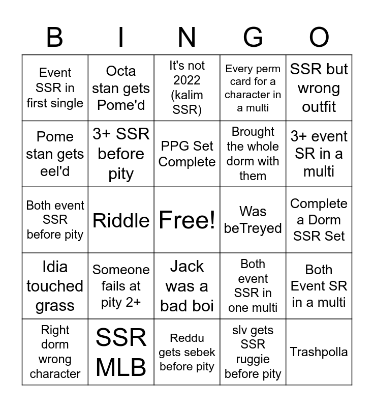 This bingo card has a free space and 24 words: Someone fails at pity 2+, SSR MLB, PPG Set Complete, Right dorm wrong character, SSR but wrong outfit, Event SSR in first single, Pome stan gets eel'd, Octa stan gets Pome'd, Was beTreyed, Jack was a bad boi, Brought the whole dorm with them, Both event SSR before pity, Both event SSR in one multi, Both Event SR in a multi, 3+ SSR before pity, slv gets SSR ruggie before pity, Complete a Dorm SSR Set, It's not 2022 (kalim SSR), 3+ event SR in a multi, Riddle, Trashpolla, Idia touched grass, Every perm card for a character in a multi and Reddu gets sebek before pity.
