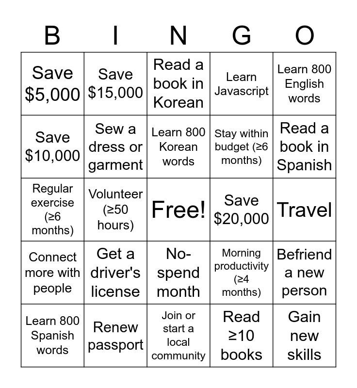 This bingo card has a free space and 24 words: Get a driver's license, Renew passport, Learn 800 Korean words, Learn 800 Spanish words, Learn 800 English words, Save $5,000, Save $10,000, Save $15,000, Save $20,000, No-spend month, Stay within budget (≥6 months), Regular exercise (≥6 months), Morning productivity (≥4 months), Befriend a new person, Sew a dress or garment, Read ≥10 books, Travel, Read a book in Korean, Read a book in Spanish, Volunteer (≥50 hours), Gain new skills, Connect more with people, Learn Javascript and Join or start a local community.