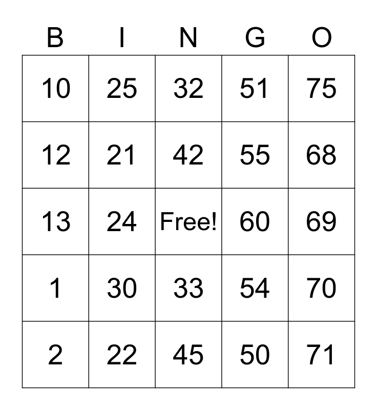 This bingo card has a free space and 24 words: 2, 30, 42, 50, 75, 10, 25, 32, 60, 69, 13, 21, 54, 70, 12, 22, 45, 51, 68, 1, 24, 33, 55 and 71.