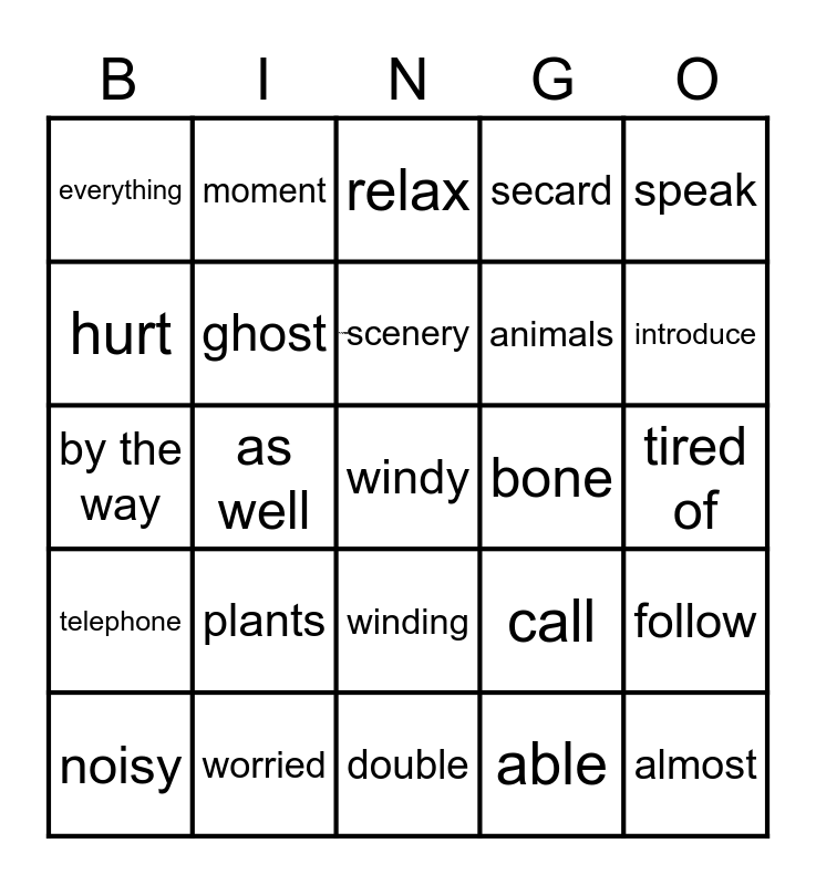 This bingo card has 1 images, a free space and 24 words: plants, worried, scenery, noisy, speak, everything, hurt, moment, bone, winding, animals, by the way, call, follow, ghost, able, tired of, relax, introduce, as well, almost, telephone, secard and double.