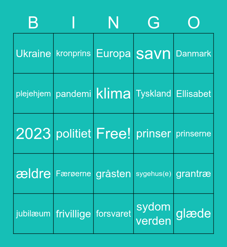 This bingo card has a free space and 73 words: Danmark, børnebørn, Ukraine, fodbold, hverdagshelte, klima, ældre, 2022, sygehus(e), jubilæum, savn, afstand, pandemi, prinserne, kronprinseparret, kronprins, forsvaret, plejehjem, festival, prinser, klima, savn, Danmark, børnebørn, jubilæum, Ukraine, fodbold, sygehuse, alvor, afstand, frivillige, sygeplejersker, kærlighed, prins Joacim, politiet, ældre, karantæne, samfund, glæde, prins Christian, sydom verden, Færøerne, Nuuk, arbejde, gud, Tyskland, Europa, Fred, MeToo, 2023, nytårsaften, nytårshilsen, prins Henrik, landsholdet, søsensfolk, Grønland, Dannebrog, gråsten, Amalienborg, håb, bevare, generationer, Corona, Ellisabet, valget, tiktok, sommer, jul, grantræ, sne, hverdagshelte, alvor and taknemlig(hed).