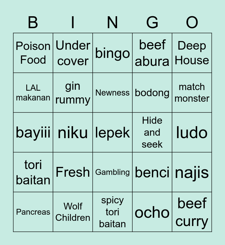 This bingo card has a free space and 24 words: Fresh, Wolf Children, Newness, Pancreas, Deep House, Poison Food, LAL makanan, Under cover, Hide and seek, Gambling, bodong, bayiii, benci, najis, gin rummy, ocho, ludo, bingo, match monster, niku, beef curry, tori baitan, beef abura and spicy tori baitan.