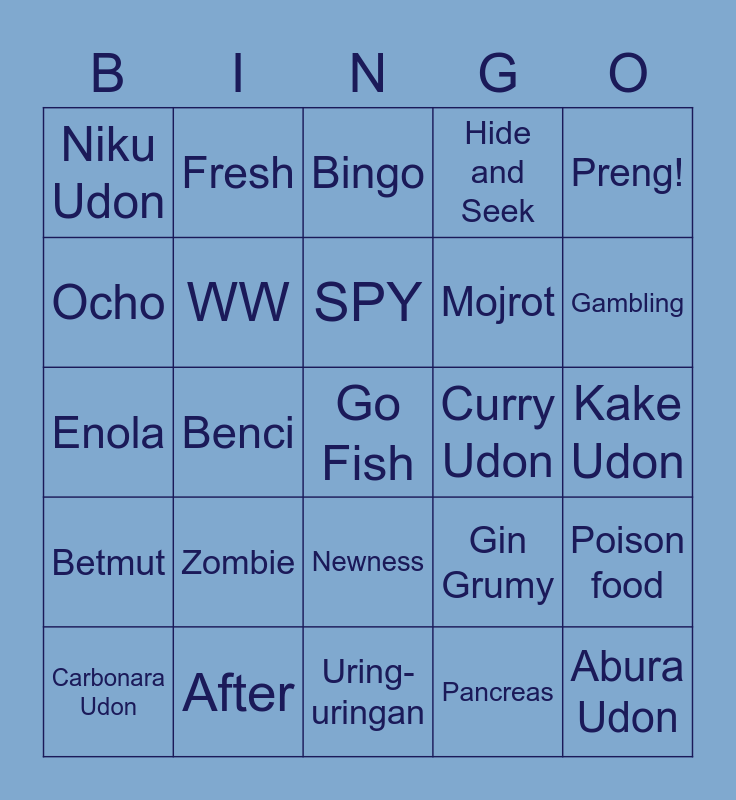 This bingo card has a free space and 24 words: Zombie, After, SPY, Carbonara Udon, Preng!, Niku Udon, Ocho, Fresh, Curry Udon, Newness, Mojrot, Enola, Gin Grumy, Poison food, WW, Pancreas, Kake Udon, Bingo, Gambling, Benci, Abura Udon, Betmut, Hide and Seek and Uring- uringan.