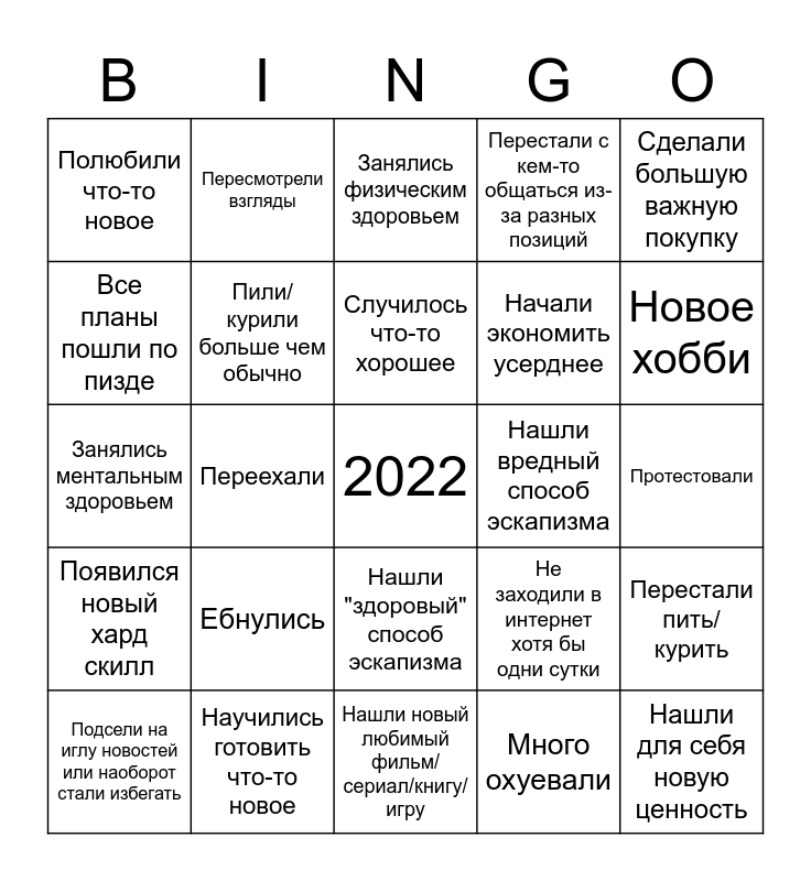 This bingo card has a free space and 24 words: Ебнулись, Научились готовить что-то новое, Случилось что-то хорошее, Подсели на иглу новостей или наоборот стали избегать, Сделали большую важную покупку, Полюбили что-то новое, Все планы пошли по пизде, Пересмотрели взгляды, Нашли вредный способ эскапизма, Нашли "здоровый" способ эскапизма, Начали экономить усерднее, Занялись ментальным здоровьем, Не заходили в интернет хотя бы одни сутки, Перестали пить/курить, Пили/курили больше чем обычно, Много охуевали, Протестовали, Занялись физическим здоровьем, Новое хобби, Переехали, Нашли для себя новую ценность, Появился новый хард скилл, Перестали с кем-то общаться из-за разных позиций and Нашли новый любимый фильм/сериал/книгу/игру.