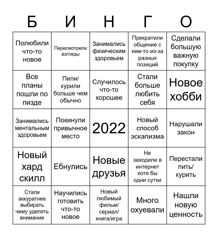 This bingo card has a free space and 24 words: Ебнулись, Научились готовить что-то новое, Случилось что-то хорошее, Стали аккуратнее выбирать чему уделять внимание, Сделали большую важную покупку, Полюбили что-то новое, Все планы пошли по пизде, Пересмотрели взгляды, Новый способ эскапизма, Новые друзья, Стали больше любить себя, Занимались ментальным здоровьем, Не заходили в интернет хотя бы одни сутки, Перестали пить/курить, Пили/курили больше чем обычно, Много охуевали, Нарушали закон, Занимались физическим здоровьем, Новое хобби, Покинули привычное место, Нашли новую ценность, Новый хард скилл, Прекратили общение с кем-то из-за разных позиций and Новый любимый фильм/сериал/книга/игра.