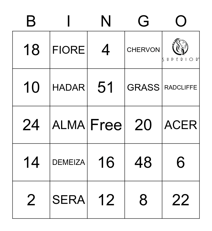 This bingo card has 1 images, a free space and 23 words: 2, DEMEIZA, 51, 8, 18, FIORE, 4, 20, ACER, 24, HADAR, 48, 6, 10, SERA, 12, CHERVON, RADCLIFFE, 14, ALMA, 16, GRASS and 22.