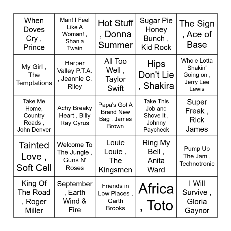 This bingo card has 104 words: The Twist , Chubby Checker, Billie Jean , Michael Jackson, The Sign , Ace of Base, Uptown Funk , Bruno Mars, Mark Ronson, I Gotta Feeling , Black Eyed Peas, Physical , Olivia Newton-John, Tossin' And Turnin' , Bobby Lewis, Low , Flo Rida, T-Pain, (I Can't Get No) Satisfaction , The Rolling Stones, I Heard It Through The Grapevine , Marvin Gaye, Play That Funky Music , Wild Cherry, Smooth Santana , Robert Neary, You're So Vain , Carly Simon, I Love Rock 'N Roll , Joan Jett & the Blackhearts, My Sharona , The Knack, You Ain't Nothing But A Hound Dog , Music Box, Hot Stuff , Donna Summer, Let's Get It On , Marvin Gaye, Good Vibrations , The Beach Boys, Whoomp! There It Is , Tag Team, Gold Digger , Kanye West, Centerfold , The J. Geils Band, I'm a Believer , The Monkees, Abracadabra , The Steve Miller Band, Le Freak , Chic, Welcome To The Jungle , Guns N' Roses, Whole Lotta Shakin' Going on , Jerry Lee Lewis, Sugar Pie Honey Bunch , Kid Rock, House Of The Rising Sun , The Animals, Goodbye Earl , The Chicks, Ring My Bell , Anita Ward, Africa , Toto, Y.M.C.A. , Village People, Stayin Alive , Bee Gees, Good Golly Miss Molly , Little Richard, (You Make Me Feel Like) A Natural Woman , Aretha Franklin, Kiss , Prince, I Walk the Line , Johnny Cash, All Too Well , Taylor Swift, September , Earth Wind & Fire, Jolene , Dolly Parton, Tainted Love , Soft Cell, Tiny Dancer , Elton John, My Girl , The Temptations, (Sittin' On) the Dock of the Bay , Otis Redding, When Doves Cry , Prince, Tootie Fruity , Johnie B. Sanders, Papa's Got A Brand New Bag , James Brown, Johnny B. Goode , Chuck Berry, I Will Survive , Gloria Gaynor, Dancing in the Street , David Bowie, Crazy In Love , Jay-Z, Hey Ya! , Outkast, Dreams , Fleetwood Mac, Get Ur Freak On , Missy Elliott, Like a Rolling Stone , Bob Dylan, Respect , Aretha Franklin, Dream On , Aerosmith, Crazy , Patsy Cline, Louie Louie , The Kingsmen, Super Freak , Rick James, Before He Cheats , Carrie Underwood, Fancy , Reba McEntire, Somebody Like You , Keith Urban, Islands In the Stream , Kenny Rogers, Rhinestone Cowboy , Glen Campbell, Follow Your Arrow , Kacey Musgraves, Man! I Feel Like A Woman! , Shania Twain, Take Me Home, Country Roads , John Denver, Achy Breaky Heart , Billy Ray Cyrus, Friends in Low Places , Garth Brooks, Rose Garden , Lynn Anderson, The Devil Went Down to Georgia , The Charlie Daniels Band, Ring of Fire , Johnny Cash, Redneck Woman , Gretchen Wilson, Guitars, Cadillacs , Dwight Yoakam, The Happiest Girl In The Whole U.S.A. , Donna Fargo, King Of The Road , Roger Miller, Passionate Kisses , Mary Chapin Carpenter, Mountain Music , Alabama, Bye Bye Bye , *Nsync, I Fall to Pieces , Patsy Cline, Harper Valley P.T.A. , Jeannie C. Riley, Bye Bye Love , The Everly Brothers, Take This Job and Shove It , Johnny Paycheck, Dancing Queen , ABBA, Celebration , Kool and The Gang, Brick House , The Commodores, Get Down Tonight , KC And The Sunshine Band, 1999 , Prince, Single Ladies , Beyoncé, Push It , Salt-n-Pepa, Wake Me Up Before You Go-Go , Wham!, Pump Up The Jam , Technotronic, Dancing with Myself , Billy Idol, SexyBack , Justin Timberlake, Just Dance , Lady Gaga, Colby O'Donis, Hips Don't Lie , Shakira, California Gurls , Katy Perry, Fight For Your Right , Beastie Boys, Wannabe , Spice Girls, I Wanna Dance with Somebody (Who Loves Me) , Whitney Houston, Here Comes The Hotstepper , Ini Kamoze and What I Like About You , The Romantics.