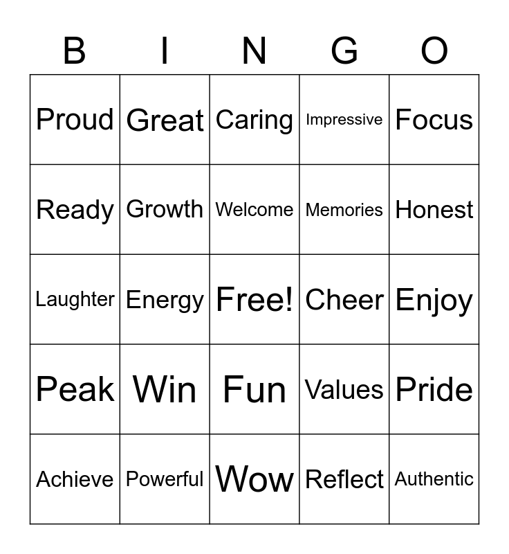 This bingo card has a free space and 24 words: Win, Powerful, Welcome, Achieve, Focus, Proud, Ready, Great, Cheer, Fun, Memories, Laughter, Values, Pride, Growth, Reflect, Enjoy, Caring, Honest, Energy, Authentic, Peak, Impressive and Wow.