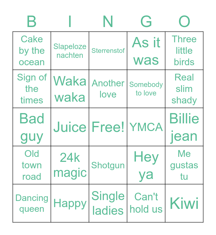 This bingo card has a free space and 29 words: Dancing queen, Get lucky, Juice, Amigo, Cake by the ocean, Sterrenstof, Waka waka, 24k magic, YMCA, Happy, Billie jean, Kiwi, Single ladies, Can't hold us, Real slim shady, Running up that hill, Shotgun, Old town road, Three little birds, Bad guy, Hey ya, Last friday night, Somebody to love, Sign of the times, As it was, Slapeloze nachten, Me gustas tu, Another love and Creep.