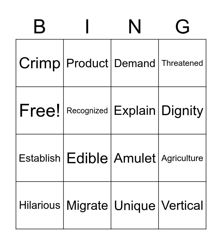 This bingo card has 16 words: Migrate, Agriculture, Demand, Crimp, Establish, Product, Amulet, Unique, Free!, Recognized, Hilarious, Threatened, Edible, Dignity, Explain and Vertical.