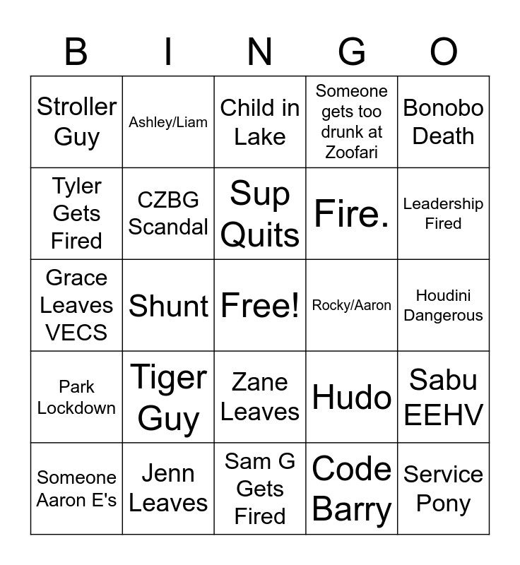 This bingo card has a free space and 24 words: Tiger Guy, Jenn Leaves, Sup Quits, Someone Aaron E's, Bonobo Death, Stroller Guy, Tyler Gets Fired, Ashley/Liam, Rocky/Aaron, Zane Leaves, Fire., Grace Leaves VECS, Hudo, Sabu EEHV, CZBG Scandal, Code Barry, Houdini Dangerous, Child in Lake, Leadership Fired, Shunt, Service Pony, Park Lockdown, Someone gets too drunk at Zoofari and Sam G Gets Fired.