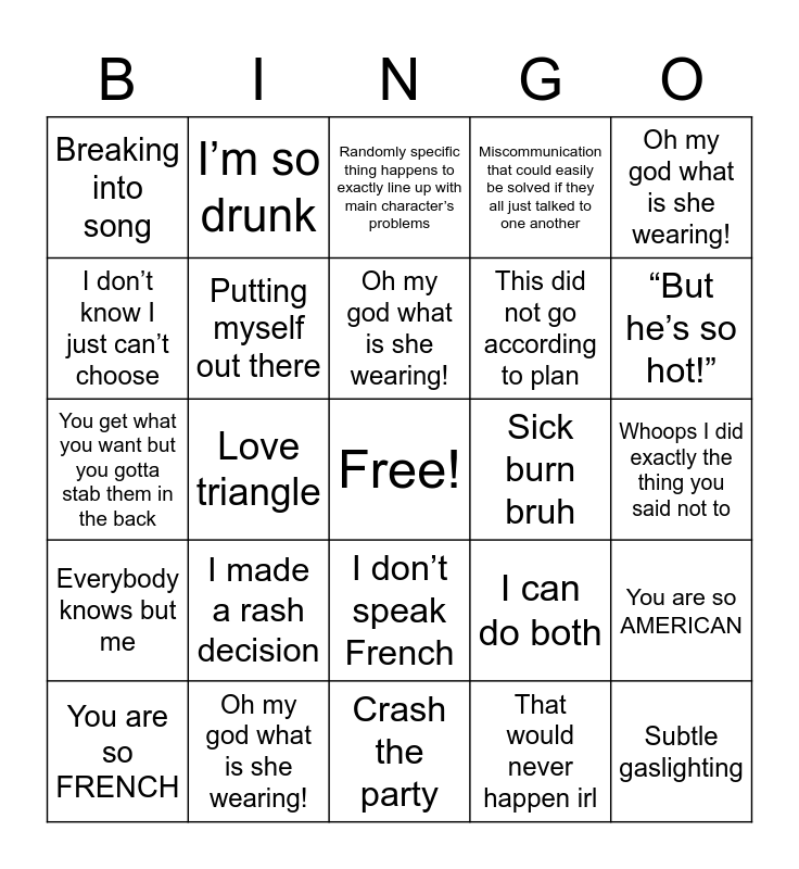 This bingo card has a free space and 26 words: I don’t speak French, That would never happen irl, Oh my god what is she wearing!, Oh my god what is she wearing!, Oh my god what is she wearing!, Breaking into song, I don’t know I just can’t choose, I’m so drunk, Whoops I did exactly the thing you said not to, I can do both, This did not go according to plan, You get what you want but you gotta stab them in the back, You are so AMERICAN, You are so FRENCH, Love triangle, Eiffel Tower, Miscommunication that could easily be solved if they all just talked to one another, Everybody knows but me, Randomly specific thing happens to exactly line up with main character’s problems, Subtle gaslighting, “But he’s so hot!”, Crash the party, Sick burn bruh, I made a rash decision, Putting myself out there and Big romantic gesture.