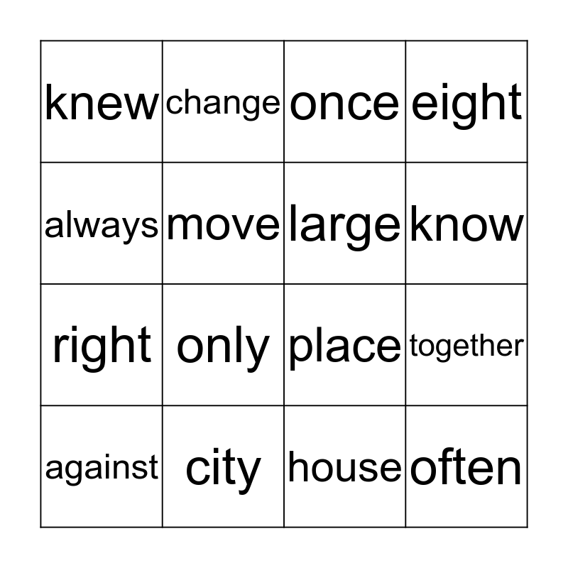 This bingo card has a free space and 15 words: against, often, once, knew, know, always, only, house, move, right, together, eight, large, change and city.