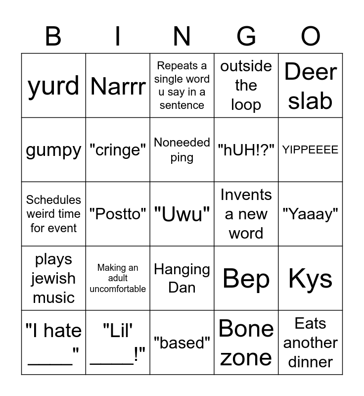This bingo card has a free space and 42 words: "AAAAAAAA", Noneeded ping, Cat emoji, Making an adult uncomfortable, Bone zone, Kys, Eats another dinner, "WAHOOOOO", Repeats a single word u say in a sentence, Hanging Dan, "Yaaay", YIPPEEEE, "Postto", Deer slab, Yells about something, Bep, Needs a pearl load, Schedules weird time for event, Pissy, Narrr, gumpy, postto sticker, plays french music, yurd, is gay, "Hai", "hUH!?", wholesome pepe emote, basted, old/dead server, "You can't say that!", plays jewish music, "cringe", "based", "i'd love to do that, BUT...", "I hate ____", "Lil' ____!", Invents a new word, "Weeyard", "AFA", outside the loop and sook.