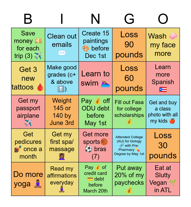 This bingo card has a free space and 24 words: Get my first spa/ massage ππΎββοΈ, Read my affirmations everyday π§πΎββοΈ, Learn to swim ππΎββοΈ, Do more yoga π§πΎββοΈ, Wash π§Ό my face more, Save money π΄ for each trip (3) βοΈ, Get 3 new tattoos π©Έ, Clean out emails βοΈ, Fill out Fasa for college scholarships π°, Get more sportsπ β½οΈ bras (7), Loss 60 pounds, Get my passport airplane βοΈ, Attended College (AU) for biology 𧬠with Pre-Pharmacy π Degree by May 1st, Loss 30 pounds, Make good grades (c+ & above β¬οΈ), Put away 20% of my paychecks π°, Get and buy a class photo with all my kids π, Create 15 paintings π¨ before Dec 1st, Learn more Spanish π΅π·, Weight 145 or 140 by June 3rd, Eat at Slutty Vegan π± in ATL, Get pedicures π πΏ once a month, Loss 90 pounds and Pay π° of credit card π³ debt before March 20th.