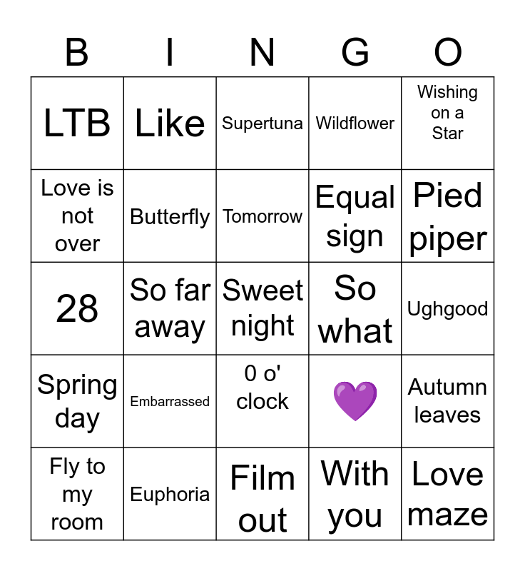 This bingo card has 25 words: Embarrassed, Film out, Tomorrow, Fly to my room, Wishing on a Star, LTB, Love is not over, Like, So what, 0 o' clock, Equal sign, 28, 💜, Autumn leaves, Butterfly, Love maze, Ughgood, Supertuna, Pied piper, So far away, Sweet night, Euphoria, Spring day, Wildflower and With you.