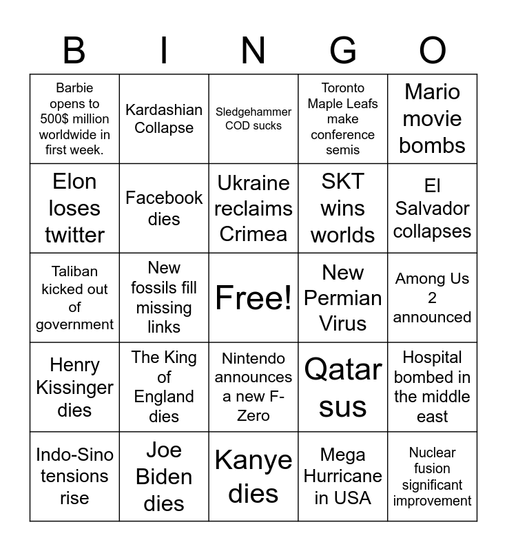 This bingo card has a free space and 24 words: The King of England dies, Joe Biden dies, Ukraine reclaims Crimea, Indo-Sino tensions rise, Mario movie bombs, Barbie opens to 500$ million worldwide in first week., Elon loses twitter, Kardashian Collapse, New Permian Virus, Nintendo announces a new F-Zero, SKT wins worlds, Taliban kicked out of government, Qatar sus, Hospital bombed in the middle east, Facebook dies, Mega Hurricane in USA, Among Us 2 announced, Sledgehammer COD sucks, El Salvador collapses, New fossils fill missing links, Nuclear fusion significant improvement, Henry Kissinger dies, Toronto Maple Leafs make conference semis and Kanye dies.