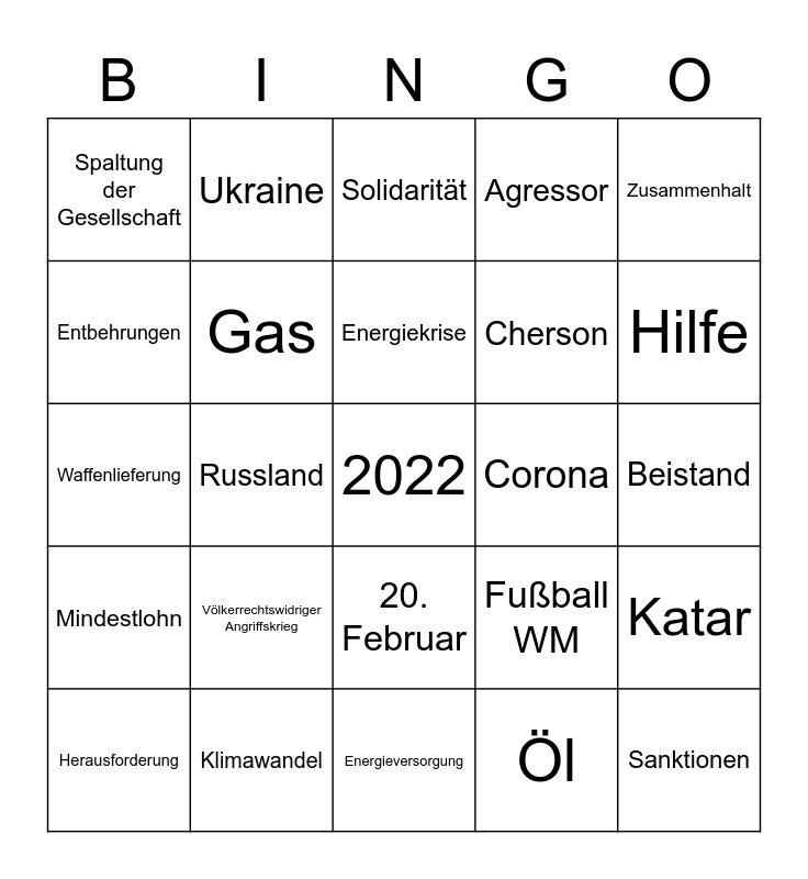 This bingo card has a free space and 24 words: Völkerrechtswidriger Angriffskrieg, Klimawandel, Energiekrise, Herausforderung, Zusammenhalt, Spaltung der Gesellschaft, Entbehrungen, Ukraine, Corona, 20. Februar, Cherson, Waffenlieferung, Fußball WM, Katar, Gas, Öl, Beistand, Solidarität, Hilfe, Russland, Sanktionen, Mindestlohn, Agressor and Energieversorgung.