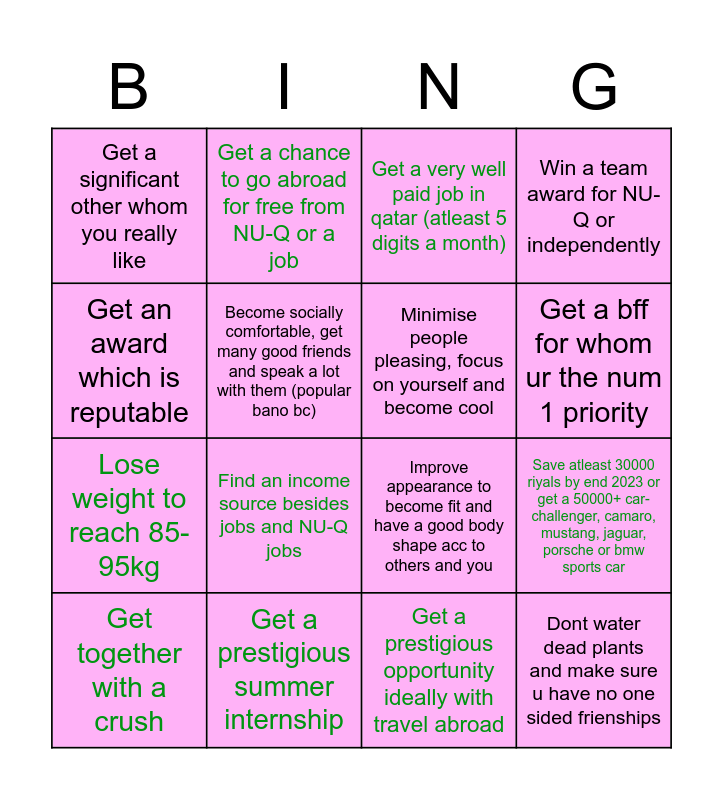 This bingo card has 16 words: Get a prestigious summer internship, Save atleast 30000 riyals by end 2023 or get a 50000+ car- challenger, camaro, mustang, jaguar, porsche or bmw sports car, Get a very well paid job in qatar (atleast 5 digits a month), Get a significant other whom you really like, Lose weight to reach 85-95kg, Get a chance to go abroad for free from NU-Q or a job, Improve appearance to become fit and have a good body shape acc to others and you, Get a prestigious opportunity ideally with travel abroad, Get an award which is reputable, Become socially comfortable, get many good friends and speak a lot with them (popular bano bc), Get together with a crush, Win a team award for NU-Q or independently, Find an income source besides jobs and NU-Q jobs, Get a bff for whom ur the num 1 priority, Minimise people pleasing, focus on yourself and become cool and Dont water dead plants and make sure u have no one sided frienships.