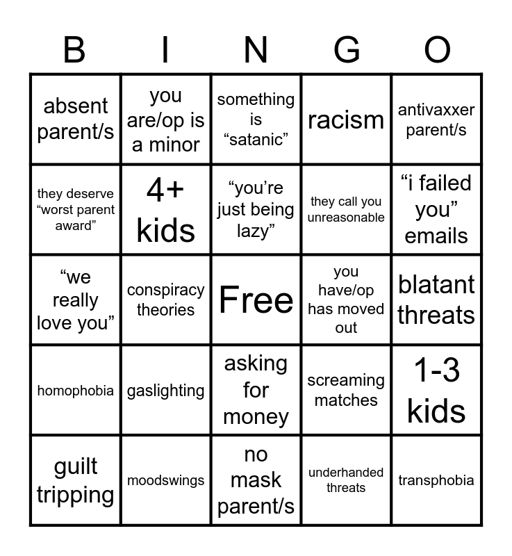 This bingo card has a free space and 24 words: gaslighting, moodswings, “you’re just being lazy”, guilt tripping, antivaxxer parent/s, absent parent/s, they deserve “worst parent award”, you are/op is a minor, you have/op has moved out, asking for money, they call you unreasonable, “we really love you”, screaming matches, 1-3 kids, 4+ kids, underhanded threats, blatant threats, something is “satanic”, “i failed you” emails, conspiracy theories, transphobia, homophobia, racism and no mask parent/s.